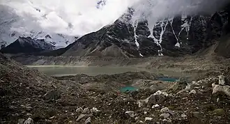 Imja Tsho (or Imja Lake) is a glacial lake created after melt water began collecting at the foot of the Imja Glacier on the lower part of the glacier in the 1950s.[2] A 2009 study described this lake of melt water as one of the fastest-growing in the Himalayas.[2] Held in place by a terminal moraine, Imja Tsho threatens downstream communities with the potential for a glacial outburst flood.[2]