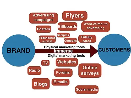 The term immersion marketing or immersive marketing includes traditional advertising, public relations, word-of-mouth advertising, digital marketing, samples, coupons, retail partnerships and other ways of surrounding the consumer with a consistent message about a brand.[1][2][3] Immersion marketing envelopes a brand or product or company issue so the marketing, advertising, and public relations departments or representatives work holistically towards delivering the same brand message across multiple distribution channels. Unlike "Shotgun marketing"[4] (communicate the message to anyone who listens), immersive marketing is cheaper and more effective, focusing directly on the customer's needs.