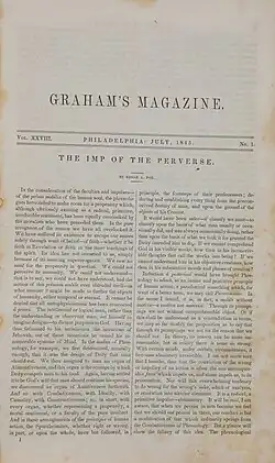 "The Imp of the Perverse" was first published in the July 1845 issue of Graham's Magazine.[9] A slightly revised version appeared in the Boston-based gift book May-Flower for 1846.[14]