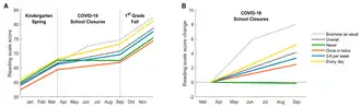 The effect of school closure on academic achievement has been studied in the summer months.[147] Many of the strategies used to prevent academic slump, such as attending summer school, visiting libraries, and/or participating in literacy-rich summer-based activities are not available during the pandemic. Reading every day to a child, an option available while staying at home, reduced the rate of loss by 42%.[10]