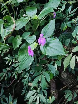 Impatiens cordata is balsam endemic to the southern Western Ghats of India. Like others in the genus, they are annual herbs growing under a foot tall with the stems prostrate. The leaves are alternate and have an ovate to cordate shape. The upper surface of the leaf is glossy and has a distinct petiole.The flowers are single or in pairs in shades of lilac with a darker purple centre. The lower sepals are funnel shaped and the spurs curve inwards.[1]