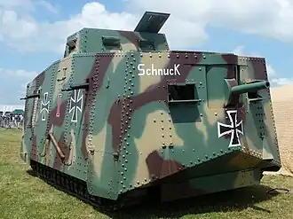 In the field of armoured vehicles, however, Germany was less advanced than the Allies. The A7V was the only tank produced by Germany and a late war product. The A7V weighed 30 tons, was armed with a 57 mm cannon and six machine guns, had up to 30 millimetres of armor and was powered by two Daimler engines with 100 hp each. However, with a top speed of 15 kilometers per hour, it was cumbersome and prone to mechanical problems[50] Specialized vehicles rounded off the range. Artillery tractors such as the Daimler Artillery prime mover[51] were developed to pull heavy guns, while motorized ambulances were used to evacuate the wounded.[52]