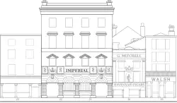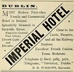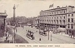 Pictorial evidence from 1850 shows a four window wide building at 21–22 Lower Sackville Street opposite the General Post Office.[4] The hotel name certainly was in use from at least 1843.[5] In 1853, it was rebuilt by William Francis Caldbeck, an amateur architect,[6] into an eight window wide building that also housed Clerys department store in the building's lower floors with the Imperial Hotel on the three upper floors whose street number was then 21–27. The ground floor department store had very tall large plate glass windows.[7] In the Alexander Thom's 1863 almanac, James H Coleman is the manager of the hotel.[8]
