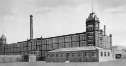 The industry produced 8 billion yards of cloth at its peak in 1912. The Great War of 1914- 1918 halted the supply of raw cotton, and the British government encouraged its colonies to build mills to spin and weave cotton. Certain towns were harder hit, as they had specialised in forms of cotton that were only required in markets where the link had been severed. After the war was over Lancashire never regained its markets and the independent mills were struggling. The Bank of England set up the Lancashire Cotton Corporation in 1929 to attempt to rationalise and save the industry.[7] Imperial Mill, Blackburn was one of 104 mills bought by the LCC, and one of the 53 mills that survived through to 1950. It was taken over be Courtaulds and spinning stopped in 1980.[8] The chimney was demolished in 1958, but the mill was left mostly intact. The Mill has been the base for the Lancashire Saw Company up to the present day.