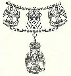 The chain, or necklace, was gold and interspersed in the links was the monogram of its founder (MIM) and the coat of arms of the Second Mexican Empire.