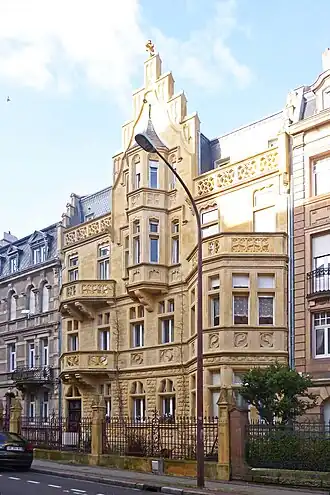 The urban guidelines of 1903 instituted a different status to the north side of the "ring" of open land that was opened up with the demolition of the old ramparts. It stipulated that this area should consist of houses encircles by gardens, having a maximum height of three floors, in order to soften the transition between the older buildings of the city center and the new, taller apartment houses that would populate the areas to the south. The villas on what is today known as the Avenue Foch in Metz exude this kind of neat and tidy character, reflecting the traditions of the period, and use a diverse, usually historicist, set of styles.[2]
