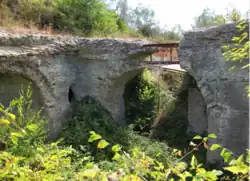 The main part of the long springhouse is a vaulted chamber 41.5 m long consisting of a main gallery of 27.5 x 1.3 m fed from the south end, and to the north a channel 14.0 m long in which the cross-section contracts.[14] At the end of the northern channel, another channel joins it with water from a rock face to the west and the total contents are fed to a steep offtake. The main source is the west wall of the main gallery where at the bottom of 13 arches built on the exposed rock face several springs issue forth. The underground arcade was replicated above ground with arches of double width covering two underground arches, but the overground structure has mainly collapsed. These were used to support the arches below and the cliff face behind, which is fragile, but also probably as a monumental feature of the aqueduct visible from the baths below.