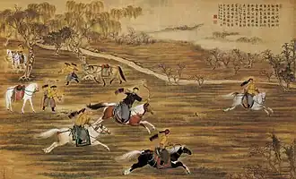 The hunts at Mulan were commemorated in paintings produced by the imperial court, much like other military rituals of the Qing.[37] This was especially true in the Qianlong era, in which commemorative art also portrayed the triannual grand inspections (dayue)[39] of Eight Banners troops, and the dual rituals of dispatching armies (mingjiang) and welcoming their return (jiaolao).[40] These works of art, as well as the activities depicted in them, all formed part of the Qianlong Emperor's propaganda campaign to promote martial values in Qing society.[41]