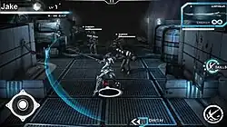 Implosion is a third-person hack-and-slash that allows players to use their mecha's sword as well as ranged gun attacks.[5] The player's mecha uses rolling to dodge enemy attacks and can combo attacks in sequence.[5] The mecha is also customizable with different parts bought from a shop, which can change how it controls, although the gameplay is mainly skill-based.[5]