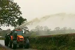 The Mark-15 was carried to the firing point on a trailer or a hydraulic hoist pulled by a tractor in several attacks. The mortar was usually concealed in straw bales.[1][71] Sometimes the mortar was welded on the tractor's rear forks,[72] like in the shooting down of a Lynx helicopter over Crossmaglen barracks on 19 March 1994 by the South Armagh Brigade.[1] Some weeks later, on 9 April 1994 at midday, a barrack-buster mortar was transported and fired by a tractor once again, this time on the British Army border checkpoint at Aughnacloy, County Tyrone. The heavy projectile landed without exploding at the rear of the base, near Coronation Park housing estate, forcing its evacuation.[73] According to other sources, the device actually exploded but caused little damage.[74] The East Tyrone Brigade report on the attack says that they took over the area between the checkpoint and the border, set a roadblock, selected a firing point some 400 yards from the target, drove the tractor in and issued a 30-minute warning.[75] On 12 July 1994, a second helicopter, an RAF Puma carrying troops was hit and forced to crash-land on a football pitch at Newtownhamilton by the explosion of another tractor-launched Mark-15.[76] A truck was used instead as firing platform in a deadly Mark-15 attack on Keady RUC/Army barracks in South Armagh on 8 March 1993, when a civilian contractor to the British Army was killed and several other personnel wounded.[77] A cattle truck, which the IRA classify as a "mobile multiple mortar launcher", was equipped to carry ten mortar tubes arranged in staggered rows on its back. The IRA's South Down Brigade used the heavy vehicle to fire ten mortar rounds at the British Army Barracks near Kilkeel, County Down.[78][79] The mortars are described as Mark-15 by author Roger Davies.[80]