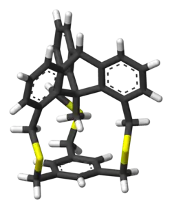 This particular compound is synthesed starting from anthracene with a methyl group added to each arene ring (1,8,9-trimethylanthracene). A triptycene compound is formed from a reaction of this anthracene compound with an aryne in a Diels-Alder reaction in isoamyl nitrite. In this synthesis the precursor to the reactive aryne is 2-amino-6-methylbenzoic acid. Next the methyl substituents are functionalized with bromine groups by the photochemical reaction with N-bromosuccinimide or NBS. The final cyclophane is put together by reaction with 1,3,5-tris(mercaptomethyl)benzene with nucleophilic sulfhydryl groups and electrophilic alkyl bromides in a nucleophilic aliphatic Substitution.