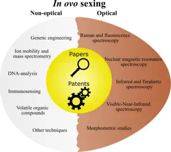 - ^ a b c Corion, M; Monteiro Belo dos Santos, S; De Ketelaere, B; Spasic, D; Hertog, M; Lammertyn, J (14 July 2023). "Trends in in ovo sexing technologies: insights and interpretation from papers and patents". Journal of Animal Science and Biotechnology. 14 (1): 102. doi:10.1186/s40104-023-00898-1. PMC 10347793. PMID 37452378.