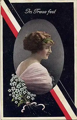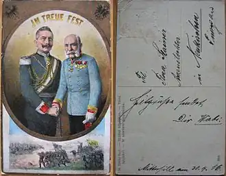 The motto is the title of two military marches, one by Carl Teike (1903, English title "Steadfast and True") and another by August Högn (1905). It is invoked in the final verse of the Argonnerwaldlied (1914). From 1909, the motto was embossed on the belt buckles of Bavarian troops.[1] During the First World War, the motto was frequently reproduced on postcards and other memorabilia, often with the portraits of emperors Wilhelm II and Franz Joseph I. The "fidelity" invoked in the motto was now interpreted as referring to the loyalty of the German Empire and Austria-Hungary to their alliance of 1879 in view of the increasing political isolation of the Central Powers on the eve of the Great War. Bernhard von Bülow invoked the mutual loyalty between Germany and Austria-Hungary in 1909 as Nibelungentreue in his Reichstag speech of 29 March 1909.