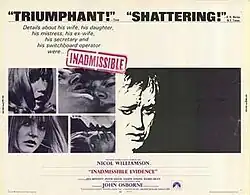 Inadmissible Evidence is a 1968 British drama film directed by Anthony Page and starring Nicol Williamson and Jill Bennett.[1][2] John Osborne wrote the screenplay, adapting his own 1964 play Inadmissible Evidence.[3] The film portrays the collapse of an angry but sad man who cannot maintain decent standards in his life and antagonises everybody. As with other Osborne plays, it is possible to see his descent as representative of his class, culture and nation.