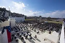 On September 3, 2020, the Capitol Police Board announced that public access to the West Front of the United States Capitol would be restricted from September 7, 2020, to February 28, 2021, to "allow for the safe and secure construction of the Inaugural platform, stands, and other infrastructure necessary to support the event".[22] Construction began on September 29, 2020.[23] The traditional "first nail ceremony" commemorating the start of construction of the inaugural platform was not held because it coincided with the death and state funeral of Ruth Bader Ginsburg, the Supreme Court justice.[24] The platform can support 1,600 spectators. However, far fewer were permitted for this event, due to attendance restrictions designed to prevent the spread of COVID-19.[4] Another 1,000 people, often choirs and musical guests, are traditionally situated on risers above the platform, but these were not used at full capacity for this event.[5]