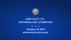 Two days before Inauguration Day, January 18, 2021, was Martin Luther King Jr. Day, the federal holiday that recognizes Dr. King's birthday. Biden and his inaugural committee encouraged Americans to engage in acts of community service and organized more than 2,500 virtual or socially distant volunteer events in 56 U.S. states and territories in partnership with AmeriCorps.[73] The committee recommended several volunteer activities aimed at improving people's economic, health, and social well-being,[74] including writing cards for those recovering from COVID-19, knitting sentimental items for the homeless, serving at "contactless" food and clothing donation drives, and participating in community cleanups.[75] Biden and his wife volunteered at Philabundance, a non-profit food bank in Philadelphia, Pennsylvania, by helping box canned goods.[76] Harris and her husband volunteered in Washington, D.C.[77]