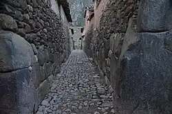 The Inca people gave great importance to open spaces for their social life. Even the first Quechua dictionaries by Santo Tomás[7] and González Holguín[8] have different words for open spaces: panpa to describe an open, common space translated into Spanish as 'plaza' or a place where there are no houses or a space for eating, drinking and merrymaking; pata normally referred to a terrace, an andén or an elevated area, and finally "kancha" with the meaning of space delimited by buildings[2]