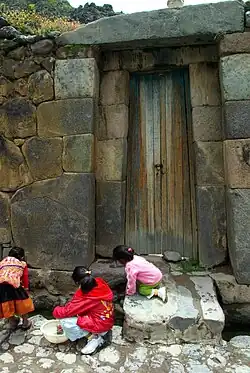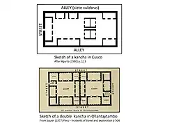 A kancha is an Inca rectangular or trapezoidal walled enclosure composed of single-room buildings that face onto a common open courtyard or inner patio in the middle of the enclosure. Kanchas are widespread in the Inca Empire and normally have only one entrance gate. An Inca kancha includes constructions intended for a single function:[1] housing, temples, palaces. In Cusco, the capital of the Empire there existed many kanchas, among them the Coricancha, the Sun temple, the Hatunkancha that housed aqllawasi the house of the acclas (chosen women of the sun) and Amarukancha, the large hall facing the main square called Huakaypata. Other notable kanchas are found in Ollantaytambo and Patallaqta.[2]: ch. 4