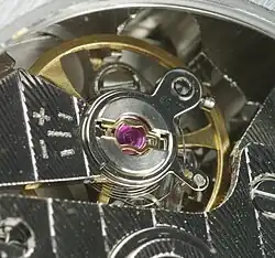 The Incabloc system uses a "lyre-shaped" spring to allow the delicate bearings to shift in their settings under impact, until a stronger shoulder of the staff contacts the strong metal endpiece, so that the pivots and bearings don't have to bear the force of the impact. When the impact is over, the springs guide the parts back to their original positions. The staff itself does not move relative to the jewel bearing, but the whole bearing is carried in a metal bushing that is free to move in the metal endpiece, under the control of the spring.[3] Some modern balance wheels use a simpler arrangement, where, taking advantage of the low cost of modern synthetic rubies, a large jewel moves as its own mobile bushing.
