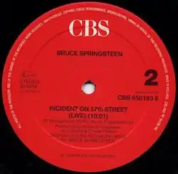 "Incident on 57th Street" was the last song Springsteen recorded for The Wild, the Innocent & the E Street Shuffle.[1] As with the rest of the album, it was recorded at 914 Sound Studios in Blauvelt, New York.[1] Springsteen had been working on it under the working title "Puerto Rican Jane."[1] It was one of the first songs on which Springsteen felt like an "observer," writing whatever came out of him rather than self-consciously trying to write something specific.[1] On the album, the piano solo at the end of the song segues directly into the guitar opening of the following song, "Rosalita (Come Out Tonight)."[2]