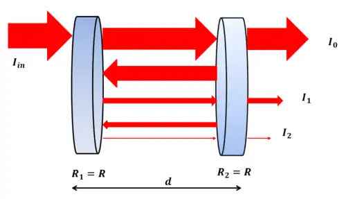 When the optical cavity is illuminated by an incoherent broadband light source like the white light of a lamp or LED, the mode structure of the cavity intensity can be neglected.[1] Consider a cavity of length d formed by two identical high reflectivity mirrors (R1 = R2 = R > 99.9%) with losses L, which is continuously excited with incoherent light of intensity Iin. For an empty resonator with L = 0, the time integrated transmitted intensity I0 is given by