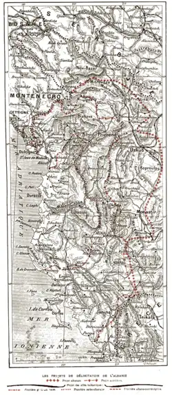 ![]() Map of the de jure boundaries of Albania according to the London Conference (1913) in white | |||||||||||||||