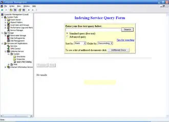 Once the indexing service has been turned on and has built its index it can be searched in three ways. The search option available from the Start menu on the Windows Taskbar will use the indexing service if it is enabled and will even accept complex queries. Queries can also be performed using either the Indexing Service Query Form in the Computer Management snap-in of Microsoft Management Console, or, alternatively, using third-party applications such as 'Aim at File' or 'Grokker Desktop'.