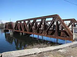 In 1882, an iron swing section replaced the manually operated one. This provided a channel of about 38 feet (12 m). However, a curve in the channel made passage through it difficult.[4] The remaining covered part of the bridge was replaced with a steel swing span in 1902 by Boston Bridge Works giving it a channel of approximately 80 feet (24 m) and aligning the draw with that of the 1885 Washington Bridge[note 2] to the north.[5] Finally, the iron swing section was replaced with fixed pony trusses in 1903. Both of these sections were built around the existing spans, so that rail and water traffic would not be interrupted. During peak working hours, trains could cross the bridge at an average rate of one every four minutes.[6]