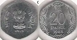 coin is a former denomination of the Indian rupee. The 20 Paise coin equals 1⁄5 of a rupee.[1]