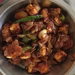 - Manchurian, generally consisting of a variety of deep-fried meats, cauliflower (gobi) or paneer with vegetables in a spicy brown sauce.[20] It is basically a creation of Chinese restaurants in India, and bears little resemblance to traditional Manchu cuisine or Chinese cuisine.[21] It is said to have been invented in 1975 by Nelson Wang; Wang described his invention process as starting from the basic ingredients of an Indian dish, namely chopped garlic, ginger, and green chillis, but next, instead of adding garam masala, he put in soy sauce, followed by cornstarch and the chicken itself.[22] A popular vegetarian variant replaces chicken with cauliflower,[20] and is commonly known as gobi manchurian. Other vegetarian variants include mushroom, paneer, baby corn, veg Manchurian.