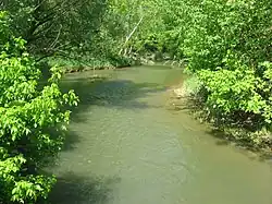 Both forks of Massies Creek flow through Cedarville Township from the east to their confluence in the township's center, whence the creek flows westward toward the Little Miami River. For the first 2 miles (3.2 km) below the confluence of the forks, the creek utilizes a shallow but sheer canyon that reaches as deep as 40 feet (12 m) below the surface of the surrounding terrain. Nathaniel Massie is reputed to have battled a Shawnee band under Tecumseh and forced them over the stream at the canyon.[2]: 537 By the early twentieth century, local residents had known the vicinity of the "Cliffs" as a picnicking ground for the past hundred years, and calls were being made for its conversion into a park.[3] In 1929, owners D.S. Williamson and a Xenia bank donated the Williamson Mound to the Ohio Historical Society.[4]: 547 Today, Indian Mound Reserve is operated as a unit of the Greene County Parks, which uses it to host events such as children's camps.[5] Hiking trails, picnic grounds, a log cabin, Cedar Cliff Falls, and the ancient earthworks are among the attractions within the park, which lies along U.S. Route 42.[6] The earthworks are located on opposite sides of the creek: the Pollock Works on the southern side, and the Williamson Mound approximately 100 rods (1650 feet, or 500 meters) away on the northern side.[7]: 34