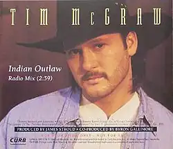 "Indian Outlaw" is a song written by Tommy Barnes, Jumpin' Gene Simmons, and John D. Loudermilk, and recorded by American country music artist Tim McGraw. It was released in January 1994 as the first single from his album Not a Moment Too Soon. It was McGraw's breakthrough and first top-40 country hit, peaking at number eight on Billboard Hot Country Singles and Tracks, and number 15 on the Billboard Hot 100.