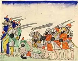 With a light cavalry force, he dashed through the Punjab in a rapid march, with the news of which reaching the Sikhs who were engaged in a siege at Jandiala. The Sikhs raised the siege and withdrew, until their position was compromised by the Afghan governor of Malerkotla.[170] Ahmad Shah led his forces including Zain Khan Sirhindi, catching the Sikhs at the village of Kup. The Sikhs, under Jassa Singh and Charat Singh, were completely defeated and massacred in an event known as the Vadda Ghalughara.[171][172] Ahmad Shah had ordered that nobody wearing Indian clothes was to be left alive, with mostly camp followers including women and children being killed.[168]