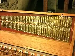 The basic components of an Indian harmonium include: a wooden body with two metal handles for carrying, banks of brass reeds (often 1, 2, or 3) set on a wooden reed board, a pumping apparatus (bellows), air stops (including stops for drones), and a keyboard (which is similar to a piano keyboard but with a smaller number of keys).[9] Some models include an octave coupler, a mechanism which links one reed valve with another note (usually the same note an octave above or below).[9]