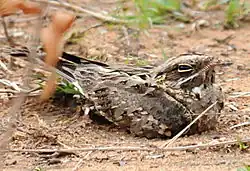 The Indian nightjar (Caprimulgus asiaticus) is a small nightjar which is a resident breeder in open lands across South Asia and Southeast Asia. Like most nightjars it is crepuscular and is best detected from its characteristic calls at dawn and dusk that have been likened to a stone skipping on a frozen lake - a series of clicks that become shorter and more rapid. They are sometimes spotted on roads when their eyes gleam red in the spotlight of a vehicle. There is considerable plumage variation across its range and can be hard to differentiate from other nightjars in the region especially in the field.
