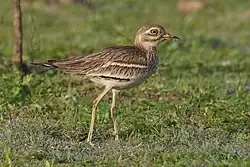 The Indian stone-curlew or Indian thick-knee (Burhinus indicus) is a species of bird in the family Burhinidae. It was formerly included as a subspecies of the Eurasian stone-curlew. This species is found in the plains of South and South-eastern Asia. They have large eyes and are brown with streaks and pale marks making it hard to spot against the background of soils and rocks. Mostly active in the dark, they produce calls similar to the true curlews, giving them their names.