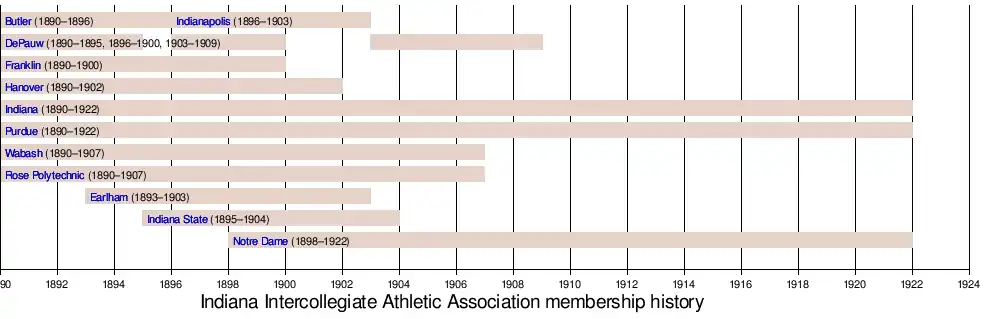 In December 1900, the IIAA expelled DePauw "for failure to conform to the rules of eligibility for players." Franklin resigned the same month, reducing the conference to nine members.[26] Hanover disappeared from the membership rolls by the end of 1902, leaving eight schools to attend the IIAA meeting that December: Indiana, Purdue, Notre Dame, Butler, Wabash, Rose Polytechnic, Earlham, and Indiana State.[27]