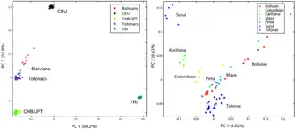 - ^ a b Moreno-Estrada, A.; Gignoux, C. R.; Fernandez-Lopez, J. C.; Zakharia, F.; Sikora, M.; Contreras, A. V.; Acuna-Alonzo, V.; Sandoval, K.; Eng, C.; Romero-Hidalgo, S.; Ortiz-Tello, P. (2014-06-13). "The genetics of Mexico recapitulates Native American substructure. It affects biomedical traits". Science. 344 (6189): 1280–1285. Bibcode:2014Sci...344.1280M. doi:10.1126/science.1251688. ISSN 0036-8075. PMC 4156478. PMID 24926019.