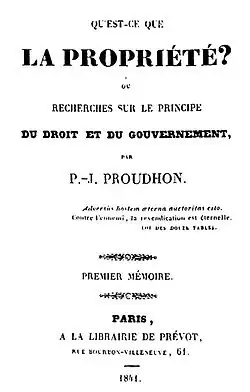 Mutualism is an anarchist school of thought which can be traced to the writings of Pierre-Joseph Proudhon, who envisioned a society where each person might possess a means of production, either individually or collectively, with trade representing equivalent amounts of labor in the free market.[13] Integral to the scheme was the establishment of a mutual-credit bank which would lend to producers at a minimal interest rate only high enough to cover the costs of administration.[14] Mutualism is based on a labor theory of value which holds that when labour or its product is sold, in exchange it ought to receive goods or services embodying "the amount of labor necessary to produce an article of exactly similar and equal utility".[15] Some mutualists believe that if the state did not intervene, individuals would receive no more income than that in proportion to the amount of labor they exert as a result of increased competition in the marketplace.[16][17] Mutualists oppose the idea of individuals receiving an income through loans, investments and rent as they believe these individuals are not labouring. Some of them argue that if state intervention ceased, these types of incomes would disappear due to increased competition in capital.[18][19] Although Proudhon opposed this type of income, he expressed that he "never meant to [...] forbid or suppress, by sovereign decree, ground rent and interest on capital. I believe that all these forms of human activity should remain free and optional for all".[20]