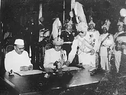 ![]() The Prime Minister of Nepal, Mohan Shamsher Jang Bahadur Rana, and the Indian Ambassador to Nepal, Chandeshwar Prasad Narayan Singh, signing the treaty, 31 July 1950 | |