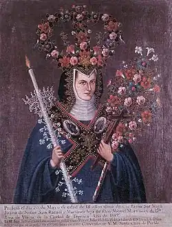 Monja Coronada (Crowned nun) is a genre of portrait paintings common among Mexican convents. These commemorative portraits of nuns wearing bridal clothes and floral crowns were common in the 18th century.[16] From a Euro-Christian perspective, the nuns' bridal trappings allude to the Virgin Mary crowned, symbolizing mystical marriage to God and victory over sin. This Christian symbolism is, however, combined with Mesoamerican imagery; the paintings frequently replace the traditional European palm frond with a Mesoamerican flower staff, and ornament the crown with flowers according to traditional flower art practices. In addition, the bird and butterfly imagery that is frequently included in crowned nun portraits may symbolize indigenous beliefs regarding the soul and the afterlife.[17]