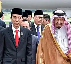 - Indonesian President Joko Widodo visited Saudi Arabia on September 12, 2015.[20] He would later visit the country again on May 21, 2017 to attend the Arab Islamic American Summit.[21] Jokowi visited Saudi Arabia for his third time on April 14 to 15, 2019.[22] In 2023, he visited the country two times.[23][24]