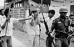 ![]() A Chinese Indonesian student at Res Publica University attacked by a crowd and being led away by soldiers, 15 October 1965 | |