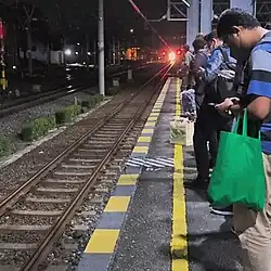 Signature 41 signals that the train is cleared to depart. Signature 41 is responded to by the engineer's signal 35. This practice is not applied to train services that are not equipped with conventional conductors such as KAI Bandara[3] or Commuter Line. The system was replaced with show-call signal 40 carried out by train service officers (customer service).[4] | |