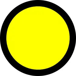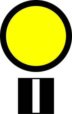 Sign 2A in the form of a yellow round sign or an officer waving a yellow flag - Semboyan 2A1: A round yellow sign with a black border (above a black square marking with a white vertical line), or an officer holding out a yellow flag or a yellow handsign in his right hand. Indicates that electric trains passing through must be careful with a maximum speed limit of 40 kilometres per hour (25 mph).