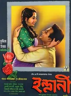 Indrani is a Bengali romantic drama film directed by Niren Lahiri based on a story of Achintya Kumar Sengupta.[1] This film was released in 1958[2] under the banner of H.N.C. Productions. Nachiketa Ghosh was the music director of the movie.[3][4] The film stars Uttam Kumar and Suchitra Sen in lead role. This was the first Bengali film where the legendary playback singer Mohammed Rafi was featured. Later he worked with Uttam Kumar in 1967 film Chhoti Si Mulaqat. The film became a blockbuster hit at the box office and ran over 70 days in theaters.
