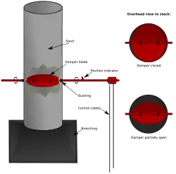 The stack damper contained within works like a butterfly valve and regulates draft (pressure difference between air intake and air exit) in the furnace, which is what pulls the flue gas through the convection section. The stack damper also regulates the heat lost through the stack. As the damper closes, the amount of heat escaping the furnace through the stack decreases, but the pressure or draft in the furnace increases which poses risks to those working around it if there are air leakages in the furnace, the flames can then escape out of the firebox or even explode if the pressure is too great.