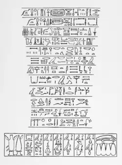 ![]() Inscription from a statue of Inebny. Hatshepsut's name in the top cartouche was later erased.[1] | |