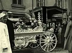 Realizing that she was exhausted from an overload of work, Lenin had urged Armand to go to the Caucasus for a holiday, without knowing that the area was suffering an epidemic and had not been pacified by the Red Army.[19] She and other patients had to be evacuated from the region. On the evening of 21 September 1920, she ventured out to meet the Nal'chik Executive Committee, perhaps to get accommodation for her group, and contracted cholera. She died in the morning hours of 24 September, aged 46.[20] A state funeral was organized, with a mass singing of the Internationale. She was buried in Mass Grave No. 5 of the Kremlin Wall Necropolis in Red Square, Moscow, being the first woman to receive this honour.[21][5][22]