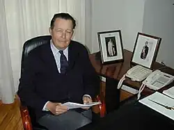 Protector of the Real Cuerpo de la Nobleza of Madrid, Maestrante of Sevilla, Zaragoza, Granada, Valencia and Ronda,[15] Member of the Real Cuerpo de la Nobleza of Catalonia, Member of the Cofradía del Santo Cáliz of Valencia, and Patron-President of the Foundation of the Military Order's Hospital of Santiago de Cuenca (Patrono-Presidente de la Fundación de las Ordenes Militares Hospital de Santiago de Cuenca). Infante Carlos was also President of the Spanish Foundation of the United World College,[16] President of the Patronato of the Naval Museum, President of the Spanish Confederation of Foundations,[17] President of the Iberoamerican Confederation of Foundations,[18] President of the Foundation of San Benito de Alcántara,[19] and President of the Foundation for the Protection of Nature (Fundación Fondo para la Protección de la Naturaleza). He died on 5 October 2015 at the age of 77, in his finca "La Toledana", in Retuerta del Bullaque.[20]
